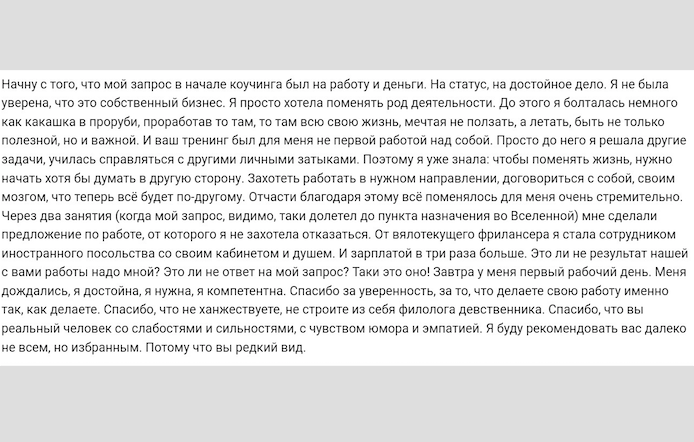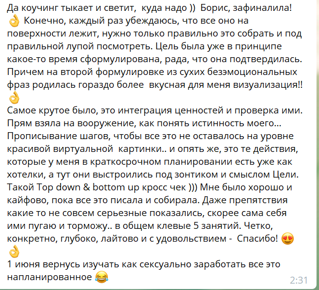 Глубокая проработка темы желаний, целей и самореализации, задействуя интуицию, логику и методы классического коучинга